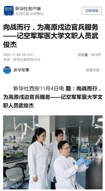 从高原哨所到科研实验室,武俊杰始终坚持“为兵服务”的初心,将科研工作锚定在官兵和人民群众迫切需求领域。