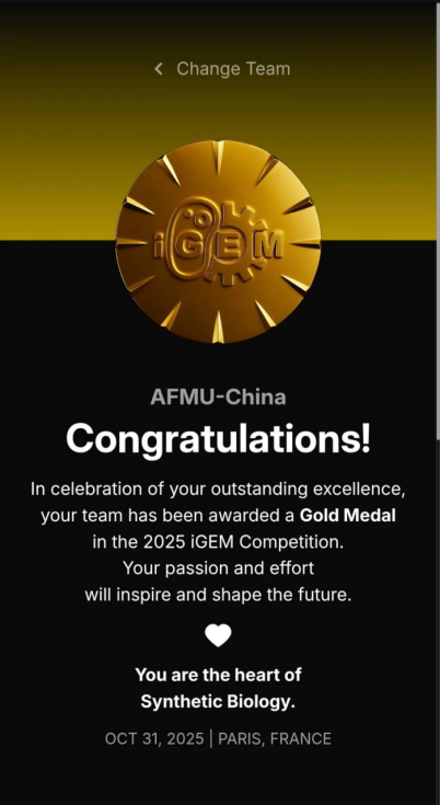 大学AFMU-China团队自2024年12月开始招募,经过选拔和培训,最终确定17名本科学员参赛。在团队成员们长达一年的辛苦付出下,自组建以来屡获佳绩,今年8月,同海内外265支队伍同台竞技,获得第四届合成生物学创新赛金奖,并选拔出陈子函,王天尧,徐皓天,王子莹四名本科学员参加全球比赛。iGEM赛场上他们游刃有余,对评委们提出的问题应对自如,经过30分钟的精彩汇报和答辩,AFMU-China团队将全球金奖收入囊中。