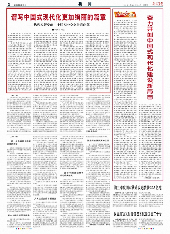 金秋时节,在举国关注和世人瞩目中,中国共产党第二十届中央委员会第四次全体会议胜利闭幕。这是在向第二个百年奋斗目标进军的新征程上举行的一次十分重要的会议,对于坚持马克思列宁主义、毛泽东思想、邓小平理论、“三个代表”重要思想、科学发展观,全面贯彻习近平新时代中国特色社会主义思想,深入贯彻党的二十大和二十届历次全会精神,凝聚起全党全军全国各族人民磅礴力量,为基本实现社会主义现代化而共同奋斗,具有重大意义。