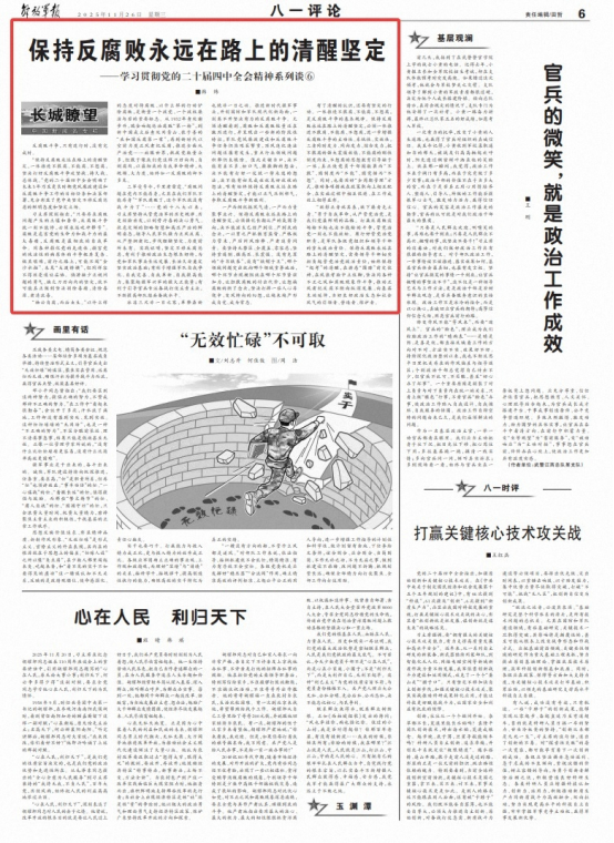 三军受号令,千里肃雷霆。“腐败问题在党内不能存身,尤其在我们军队不能存身”“军队腐败了,这个军队就没有战斗力了”……党的十八大以来,习主席坚持从管党治军的历史规律、历史经验出发,以刮骨疗毒的决心勇气、扶危定倾的胆略智慧和高压严治的鲜明姿态,领导人民军队强力正风反腐、从严整纲肃纪,步伐铿锵坚定、力度前所未有。实践证明,坚定不移反腐惩恶,有利于推动政治生态根本好转,为党和军队事业长远发展、长治久安奠定坚实政治基础;有利于增强军队自我净化、自我完善、自我革新、自我提高能力,集聚起强军兴军的强大正能量;有利于引导官兵专注备战打仗主责主业,不断提高部队练兵备战水平。
